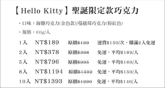 | Hello Kitty-聖誕限定款巧克力-Hello Kitty陪你一起品嚐巧克力饗宴!海鹽層次、蔓越莓果香,還有金色耀眼、粉紅戀愛的鐵盒收藏平均每入最低只要140元起(2入免運)即可購得【Hello 售價:140
