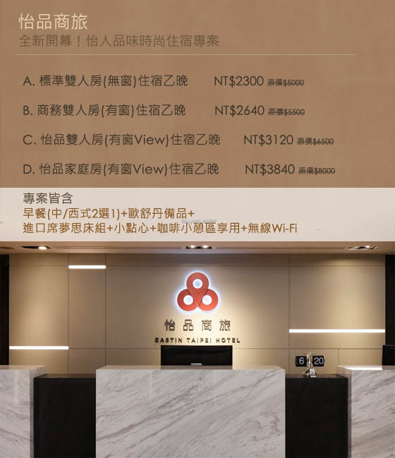 | 怡品商旅-全新開幕!怡人品味時尚住宿專案-全新開幕!有窗房型可直接看到101!位於東區即敦南商圈,美食、商家密集,時尚裝潢,打造舒適商旅文化只要2300元起即可享【怡品商旅】原價最高8000元全新開幕 售價:2300