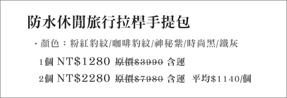 超多的鄉民很都說防水休閒旅行拉桿手提包 無敵好的!到實際到銷售的EC去看,價格就有機會再便宜一些!HEBE最近也對這個商品很感興趣,HEBE也請我幫忙收集該商品資料!整理了GOOGLE上關於防水休閒旅行拉桿手提包搜尋前幾名排序的資料來輔助! |  | 防水休閒旅行拉桿手提包-隨你旅行的好夥伴!優質面料加厚更耐用,360度滾輪暢行無阻,可拖行、可手提,和你天涯海角趴趴走!平均每個最低只要1140元起(含運)即可購得防水休閒旅行拉桿手提包1個/2個,顏 售價:1140