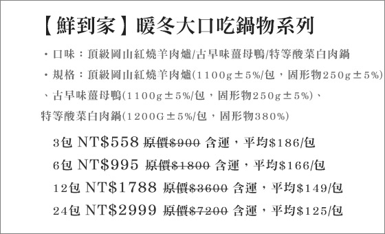 | 鮮到家-暖冬大口吃鍋物系列-大口吃超美味的暖冬鍋物!嚴選在地新鮮宰殺肉品,肉質彈嫩多汁香氣濃郁,獨家精心調配湯底鹹香可口好開胃平均每包最低只要125元起(含運)即可購得【鮮到家】暖冬大口吃鍋物系列3包 售價:125 我要購買 |